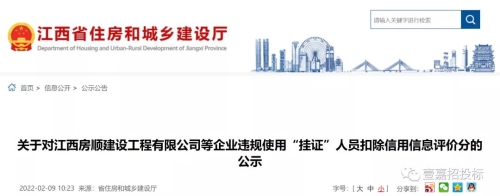 为遏制建筑市场违规“挂证”乱象,我厅依据《注册建造师管理规定》等有关要求,于2021年12月依法撤销了109名“人证不合一”的二级建造师注册证书,共涉及建筑业企业173家。根据《关于对建筑施工企业开展信用信息评价的通知》(赣建字〔2020〕4号)要求,我厅拟扣除上述违规使用“挂证”建造师的建筑企业相应信用信息评价分,有效期1年(自2021年12月27日至2022年12月26日)。现予以公示,公示期:2022年2月9日至2月14日,如有异议,请2月14日前向省住房和城乡建设厅建筑监管处反映,联系电话:0791-86225759,邮箱:jxsjstjgc@163.com。