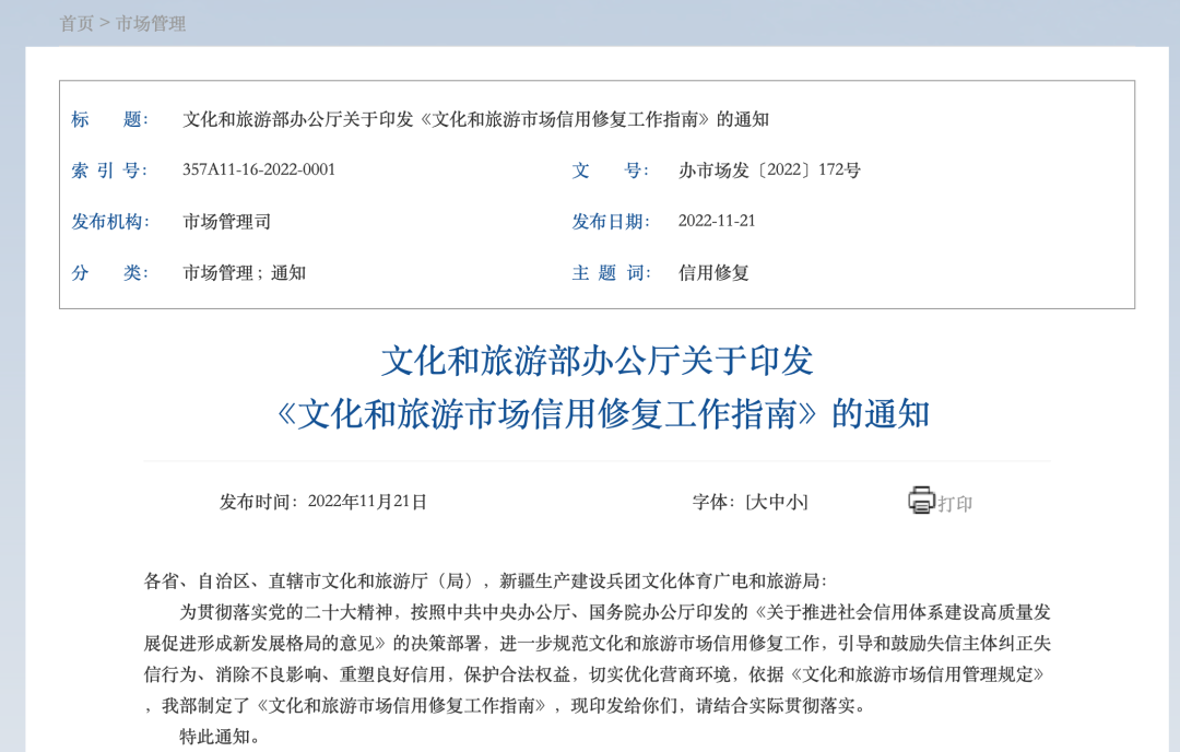 为进一步规范文化和旅游市场信用修复工作,引导和鼓励失信主体纠正失信行为、消除不良影响、重塑良好信用,保护合法权益,切实优化营商环境,文化和旅游部办公厅近日印发《文化和旅游市场信用修复工作指南》(以下简称《指南》)。《指南》从规范主动信用修复工作流程、规范核查依申请信用修复的材料、规范应用文书格式、规范开展信用修复培训、规范使用信用信息几大方面提出明确要求。