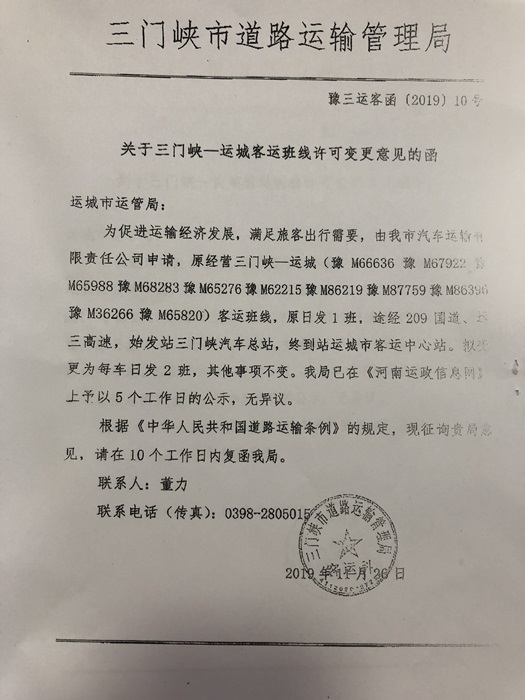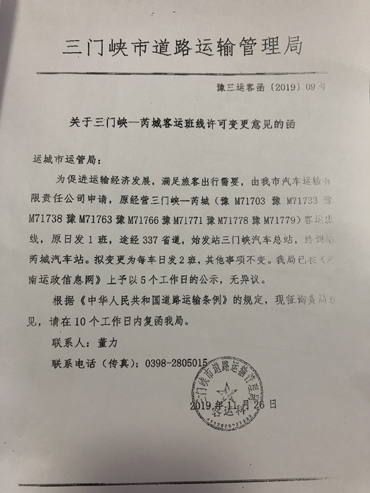 根据三门峡市道路运输管理局客运班线许可变更意见函(201909号、201910号),三门峡市汽车运输有限责任公司申请,原经营三门峡—运城(豫M66636、豫M67922、豫M65988、豫M68283、豫M65276、豫M62215、豫M86219、豫M87759、豫M86396、豫M36266、豫M65820)客运班线,原日发1班,途经209国道、运三高速,始发站三门峡汽车总站,终到站运城市客运中心站,拟变更为每车日发2班,其他事项不变。