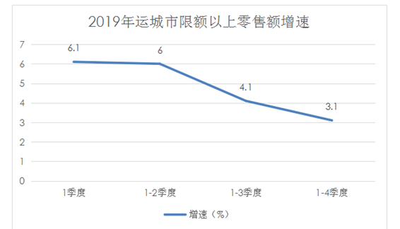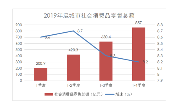 2019年,运城市坚持稳中求进工作总基调,持续深化供给侧改革,推进高质量发展,着力扩大消费需求,改善消费环境,促进消费结构持续优化,消费品市场整体呈现较快增长态势,增速略有回落。全市全年实现社会消费品零售总额857.0 亿元,同比增长 8.2%,总量和增速均位列全省第二,增长速度比全省平均增速高0.4个百分点。