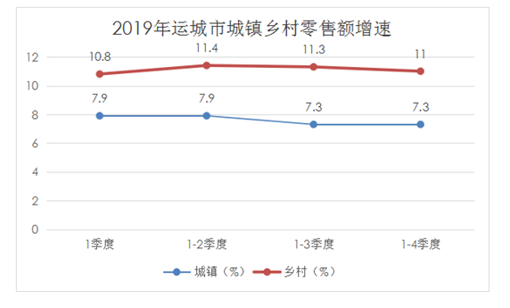 2019年,全市乡村消费品零售额实现212.3亿元,占全社会消费品零售总额比重为24.8%,同比增长11.0%。城镇消费品零售额实现 644.7 亿元,同比增长 7.3%。乡村消费增速领先城镇3.7个百分点。