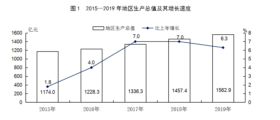 经济增长:初步核算,全年全市地区生产总值1562.9亿元,按可比价格计算,比上年增长6.3%。其中:第一产业增加值248亿元,增长3.3%;第二产业增加值540.7亿元,增长6.5%;第三产业增加值774.2亿元,增长7.2%。第三产业中,交通运输、仓储和邮政业94.3亿元,增长6.0%;批发和零售业127.2亿元,增长4.7%;金融业97.1亿元,增长5.0%;房地产业71.0亿元,增长3.2%。三次产业构成由上年的15.5:34.4:50.1,调整为15.9:34.6:49.5。