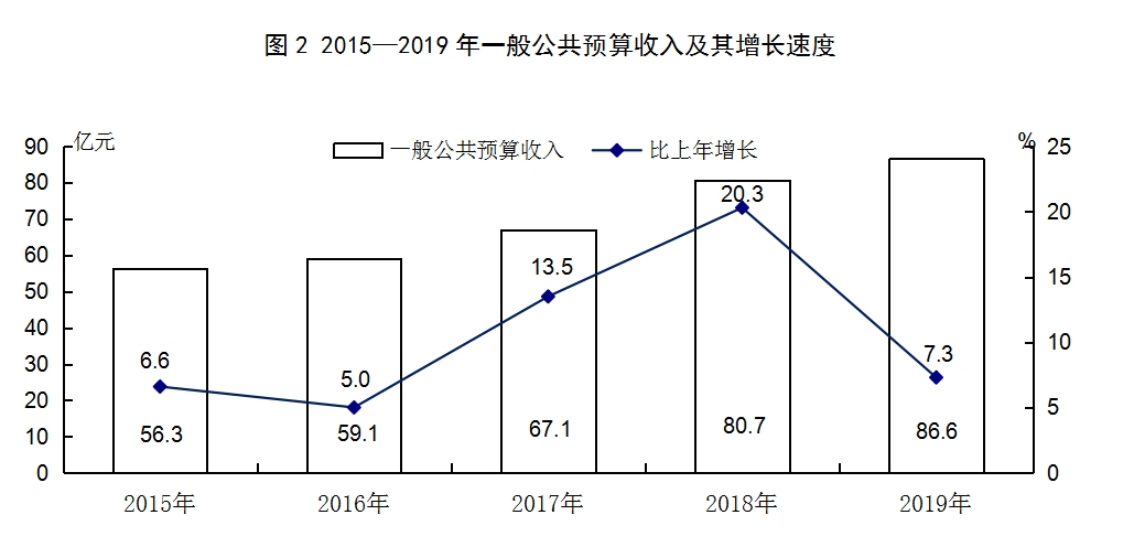 财政收入稳定增长。全年全市财政总收入完成174.8亿元,比上年增长10%。一般公共预算收入完成86.6亿元,增长7.3%。其中,税收收入完成64.5亿元,增长11.2%。全年一般公共预算支出374.2亿元,增长10.7%。