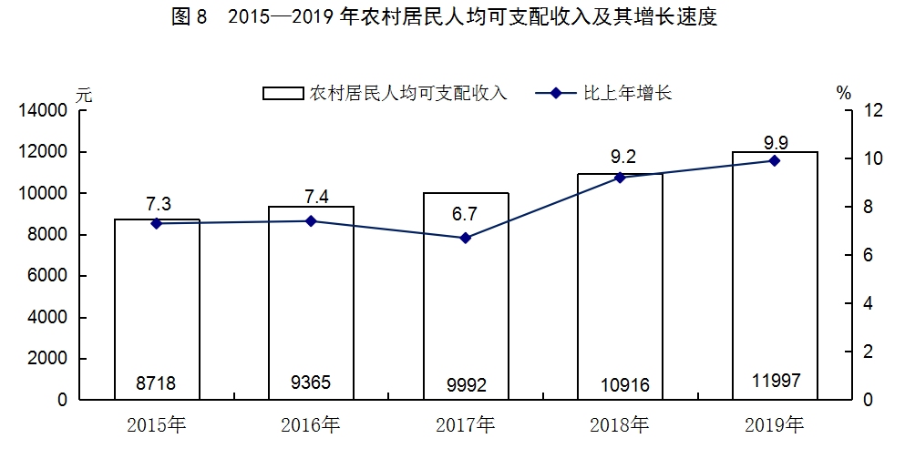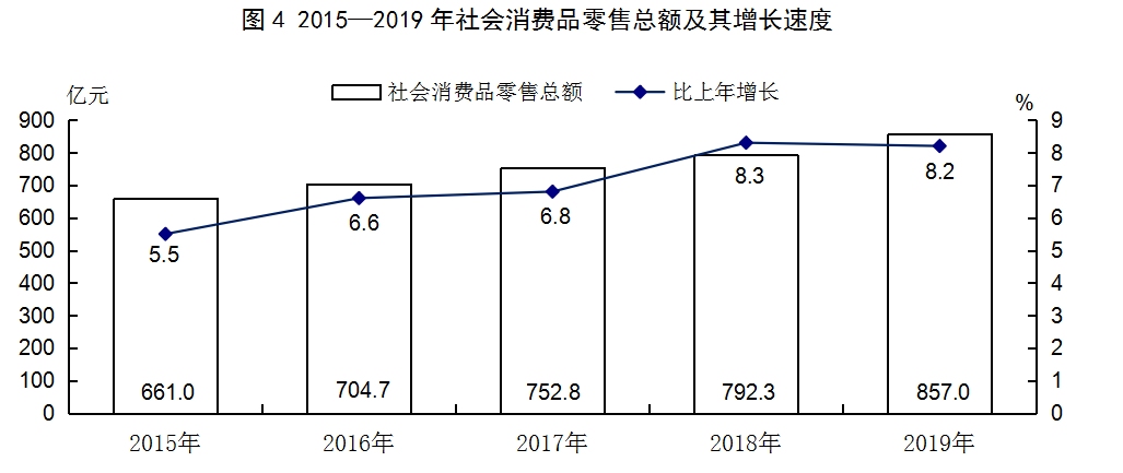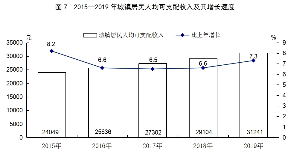 人民生活:全年全市居民人均可支配收入20406元,比上年增长9.1%。居民人均消费支出12368元,比上年增长15.5%。按常住地分,城镇居民人均可支配收入31241元,增长7.3%;城镇居民人均消费支出15807元,增长15.9%。农村居民人均可支配收入11997元,增长9.9%;农村居民人均消费支出9851元,增长13.1%。城镇占调查总户数20%的低收入家庭人均可支配收入10571元,增长9.7%;农村占调查总户数20%的低收入家庭人均可支配收入4064元,增长14.2%。