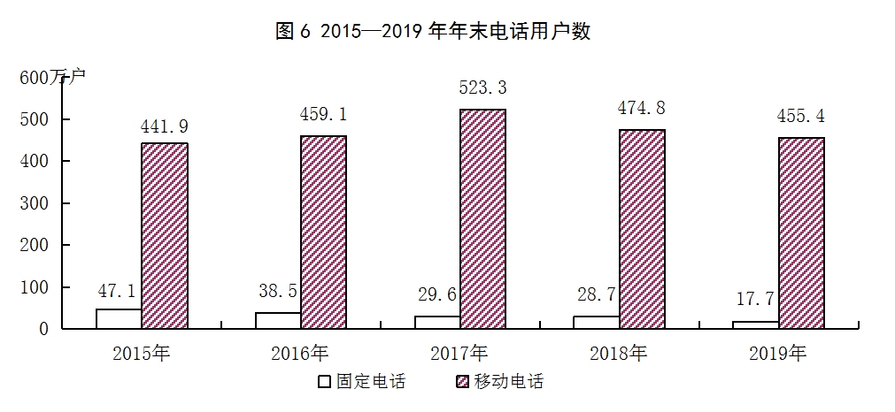 邮电:全年全市邮电业务总量263.5亿元,比上年增长89.6%。其中,邮政业务总量18.4亿元,增长59.5%;电信业务总量245.1亿元,增长92.4%。邮政业全年完成邮政函件业务49.3万件,包裹业务1.9万件,快递业务量6519万件。年末固定及移动电话用户总数达到473.1万户。其中,固定电话17.7万户,移动电话455.4万户。在移动电话用户中,4G用户415.5万户。电话普及率达到90.3部/百人。其中,固定电话和移动电话普及率分别为5.3部/百人和85部/百人。全市宽带接入用户达到154.4万户,增长12.7%。