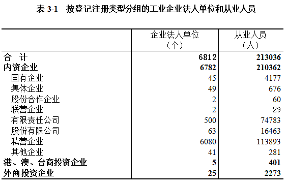 在工业企业法人单位中,内资企业6782个,占99.56%;港、澳、台商投资企业5个,占0.07%;外商投资企业25个,占0.37%。内资企业中,国有企业45个,占全部企业的0.66%;集体企业49个,占0.72%;私营企业6080个,占89.25%。