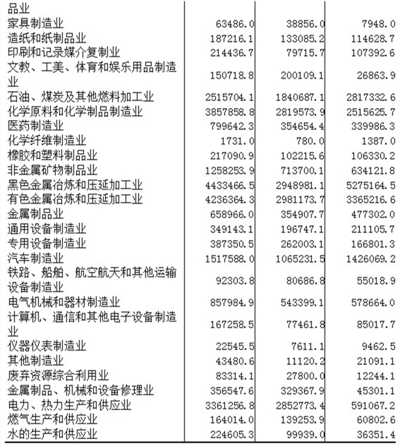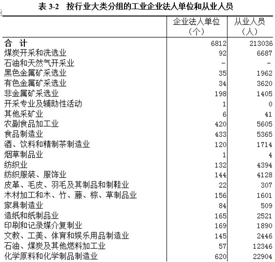 在工业企业法人单位从业人员中,采矿业占6.44%,制造业占89.27%,电力、热力、燃气及水生产和供应业占4.29%。在工业行业大类中,有色金属冶炼和压延加工业 、黑色金属冶炼和压延加工业 、化学原料和化学制品制造业从业人员数位居前三位,分别占13.53%、11.39%和10.75%(详见表3-2)。