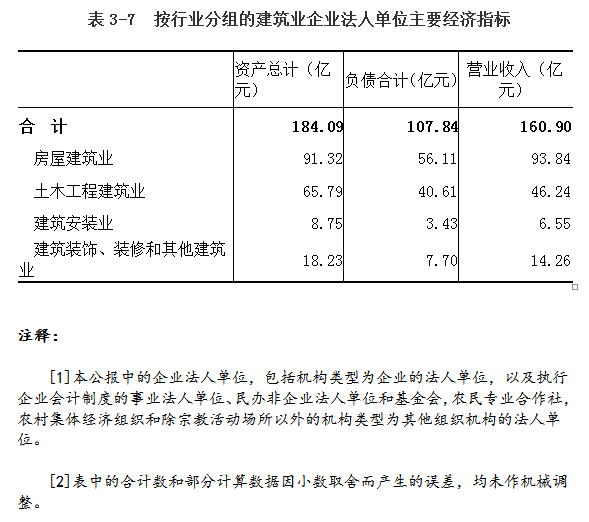 2018年末,建筑业企业法人单位资产总计184.09亿元,比2013年末增长72.37%。负债合计107.84亿元。全年实现营业收入160.9亿元(详见表3-7)。
