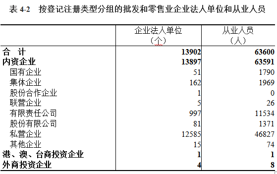 在批发和零售业企业法人单位从业人员中,内资企业占99.99%,港、澳、台商投资和外商投资企业占0.01%(详见表4-2)。