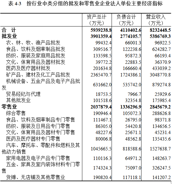 在批发和零售业企业法人单位中,批发业占57.70%,零售业占42.30%。在批发和零售业企业法人单位从业人员中,批发业占49.88%,零售业占50.12%(详见表4-1)。