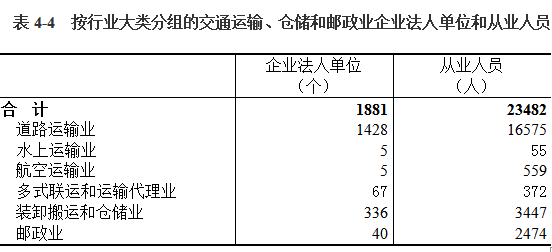 2018年末,全市共有交通运输、仓储和邮政业企业法人单位1881个,从业人员23482人,分别比2013年末增长184.14%和4.49%(详见表4-4)。