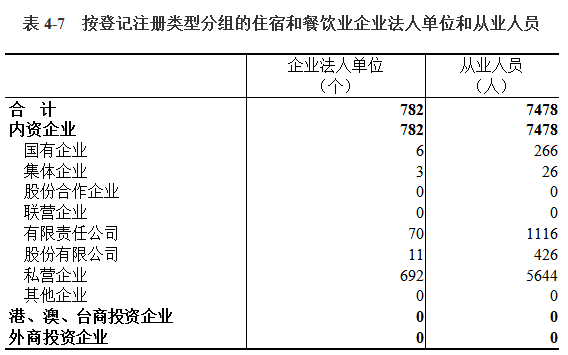 所有住宿和餐饮业企业法人单位均为内资企业(详见表4-7)。