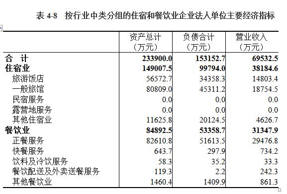 2018年末,住宿和餐饮业企业法人单位资产总计233900.0万元,比2013年末增长22.85%。其中,住宿业企业法人单位资产总计149007.5万元,餐饮业企业法人单位资产总计84892.5万元。负债合计153152.7万元。全年实现年营业收入69532.5万元(详见表4-8)。
