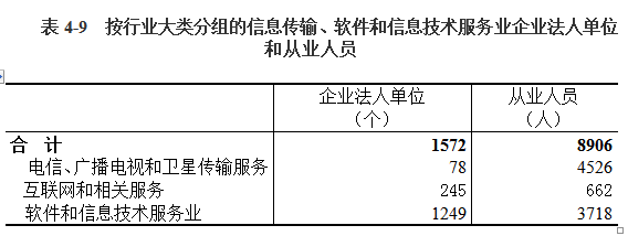 2018年末,全市共有信息传输、软件和信息技术服务业企业法人单位1572个,从业人员8906人,分别比2013年末增长2114.08 %和71.67%(详见表4-9)。