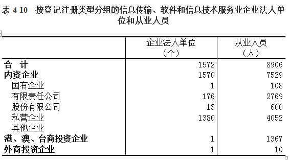 在信息传输、软件和信息技术服务业企业法人单位从业人员中,内资企业占84.54%,港、澳、台商投资企业占15.35%,外商投资企业占0.11%(详见表4-10)。
