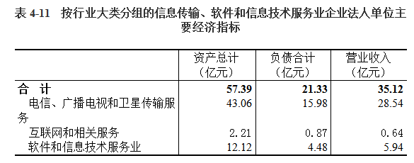 2018年末,信息传输、软件和信息技术服务业企业法人单位资产总计57.39亿元,比2013年末增长72.34%。负债合计21.33亿元。全年实现营业收入35.12亿元(详见表4-11)。