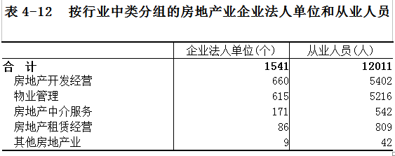 2018年末,全市共有房地产业企业法人单位1541个,比2013年末增长124.31%,从业人员为12011人,比2013年末下降9.09%。在房地产企业法人单位中,房地产开发经营业占42.83%,物业管理占39.91%,房地产中介服务占11.10%,房地产租赁经营占5.58%。在房地产企业法人单位从业人员中,房地产开发经营业占44.98%,物业管理占43.43%,房地产中介服务占4.51%,房地产租赁经营占6.74%(详见表4-12)。
