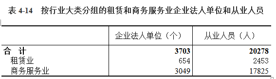 2018年末,全市共有租赁和商务服务业企业法人单位3703个,从业人员20278人,分别比2013年末增长424.5%和142.04%。