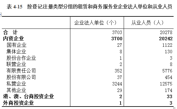 在租赁和商务服务业企业法人单位从业人员中,内资企业占99.83 %,港、澳、台商投资企业占0.16%,外商投资企业占0.01%(详见表4-15)。
