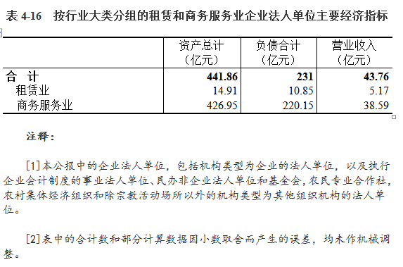 2018年末,租赁和商务服务业企业法人单位资产总计441.86亿元,比2013年末增长90.39%。负债合计231亿元。全年实现营业收入43.76亿元(详见表4-16)。