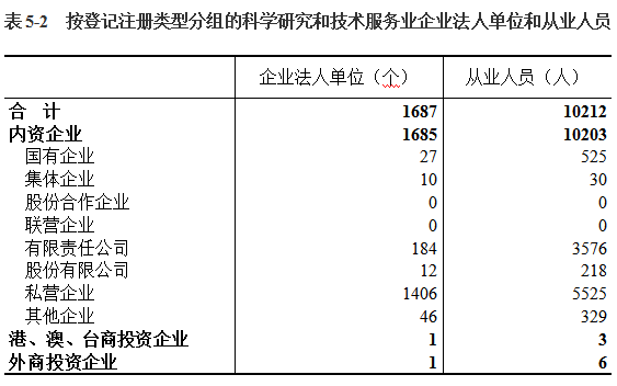 在科学研究和技术服务业企业法人单位从业人员中,内资企业占99.91%,港、澳、台商投资企业占0.03%,外商投资企业占0.06%(详见表5-2)。
