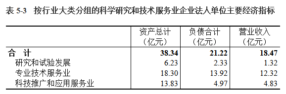 2018年末,科学研究和技术服务业企业法人单位资产总计38.34亿元,比2013年末增长22.13%。负债合计21.22亿元。全年实现营业收入18.47亿元(详见表5-3)。