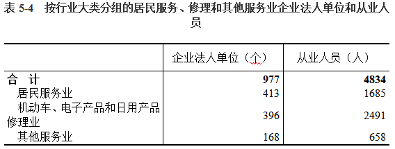 2018年末,全市共有居民服务、修理和其他服务业企业法人单位977个,从业人员4834人,分别比2013年末增长461.49%和44.04%(详见表5-4)。
