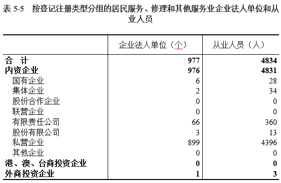 在居民服务、修理和其他服务业企业法人单位从业人员中,内资企业占99.94%,外商投资企业占0.06%(详见表5-5)。