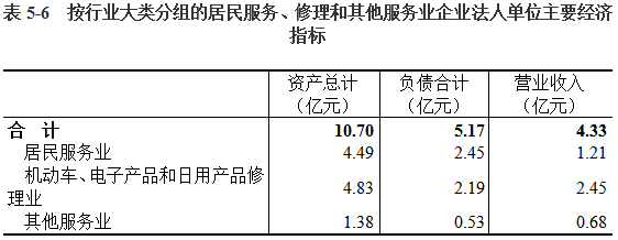 2018年末,居民服务、修理和其他服务业企业法人单位资产总计10.70亿元,比2013年末增长17.71%。负债合计5.17亿元。全年实现营业收入4.33亿元(详见表5-6)。