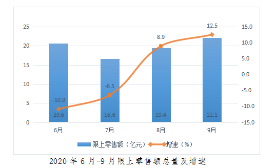 分类别商品零售数据全面向好。9月限上企业22个商品大类中,17种商品零售额实现正增长,增长面近八成。生活必需品类商品拉动明显,粮油食品、中西药品、服装鞋帽、日用品类等商品同比分别増长35.7%、24.6%、12.8%、75.5%,共同上拉限上零售额增速4.9个百分点。消费升级类商品增速加快,9月份金银珠宝类、化妆品类、体育娱乐用品类等消费升级类商品同比分别增长12.3%、14.7%、77.6%,拉动累计增速比1-8月分别提高2.8、1.2、6.2个百分点。大宗商品零售额刺激性增长,其中,9月份汽车类零售额实现5.8亿元,比8月份增长23.9%,比上年同期增长21.1%;石油及制品类零售额实现4.4亿元,比8月份增长21.0%,比上年同期增长21.8%。