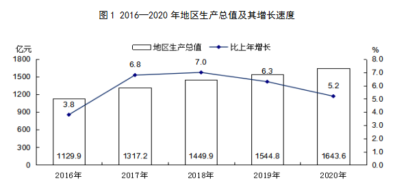 经济增长:初步核算,全年全市地区生产总值1643.6亿元,按可比价格计算,比上年增长5.2%。其中:第一产业增加值267.9亿元,增长4.1%;第二产业增加值561亿元,增长7.5%;第三产业增加值814.7亿元,增长4.1%。三次产业构成由上年的15.3:34.7:50.0,调整为16.3:34.1:49.6。