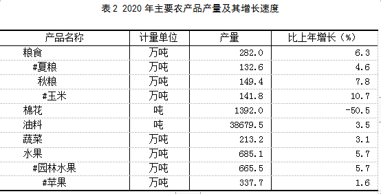 农作物种植面积:全年农作物种植面积636.7千公顷,比上年增长1.3%。粮食种植面积535.7千公顷,增长0.6%。其中,夏粮280.5千公顷,下降2.2%;秋粮255.2千公顷,增长3.8%(玉米232.6千公顷,增长10.1%);棉花种植面积1.0千公顷,下降54.6%;油料种植面积16.4千公顷,与去年同期持平;蔬菜及食用菌种植面积46.3千公顷,增长2.7%;果园面积198.6千公顷,增长2.0%,其中,苹果园面积88.1千公顷,下降2.8%。