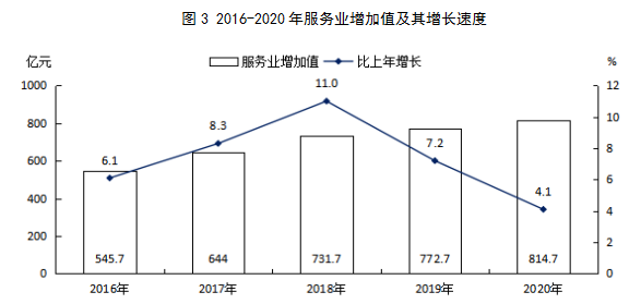 全年全市服务业增加值814.7亿元,增长4.1%。其中,批发和零售业增加值138亿元,比上年增长10.5%;交通运输、仓储和邮政业100.9亿元,增长3.2%;住宿和餐饮业增加值13.5亿元,下降4.6%;金融业101.8亿元,增长6.5%;房地产业79.6亿元,增长7.6%;其他服务业362.4亿元,增长1.1%。全年规模以上服务业企业营业收入比上年增长1.0%,利润总额增长16.4%。