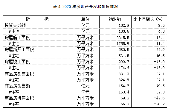 房地产开发:全年全市房地产开发投资162.9亿元,比上年增长8.5%。其中,住宅投资133.5亿元,增长4.3%。