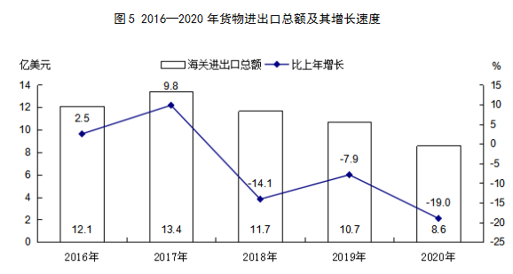 全年进口锰矿砂10.2亿元,下降3.6%;进口铜矿砂20亿元,下降27.5%;进口铬矿砂2.9亿元,增长16.1%。全年出口镁及镁制品6.0亿元,增长0.7%;出口机电产品5.3亿元,下降11.6%;出口果蔬汁1.3亿元,增长11.8%;出口纺织物3.8亿元,下降19.7%。