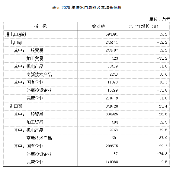 进出口贸易:全年全市进出口总额59.5亿元,比上年下降19.2%(以美元计价为8.6亿美元,下降19%)。其中,进口35亿元,下降23.4%(以美元计价为5.1亿美元,下降23%);出口24.5亿元,下降12.2%(以美元计价为3.6亿美元,下降12.3%)。