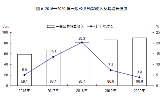 财政收入稳定增长。全年全市财政总收入完成168.7亿元,比上年下降3.5%。一般公共预算收入完成90亿元,增长3.9%。其中,税收收入完成64.3亿元,下降0.3%。全年一般公共预算支出417.7亿元,增长11.6%。全年减税降费54.4亿元,其中,落实新增减税降费政策共减免税费11亿元。