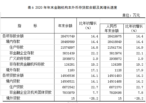 金融:年末全部金融机构本外币各项存款余额2847.1亿元,比年初增长14.4%,其中人民币各项存款余额2842亿元,比年初增长14.4%。全部金融机构本外币各项贷款余额1450.7亿元,比年初增长14.1%,其中人民币各项贷款余额1450.1亿元,比年初增长14.2%。
