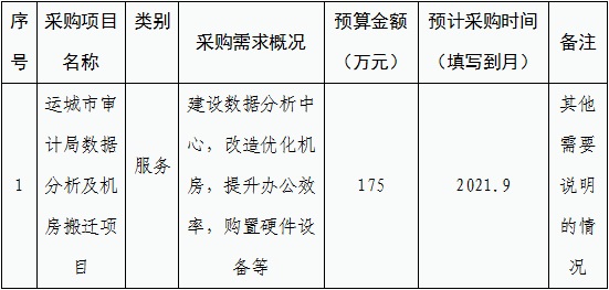 为便于供应商及时了解政府采购信息,根据《财政部关于开展政府采购意向工作的通知》(财库〔2020〕10号)等有关规定,现将运城市审计局2021年9月至12月采购意向公开如下: