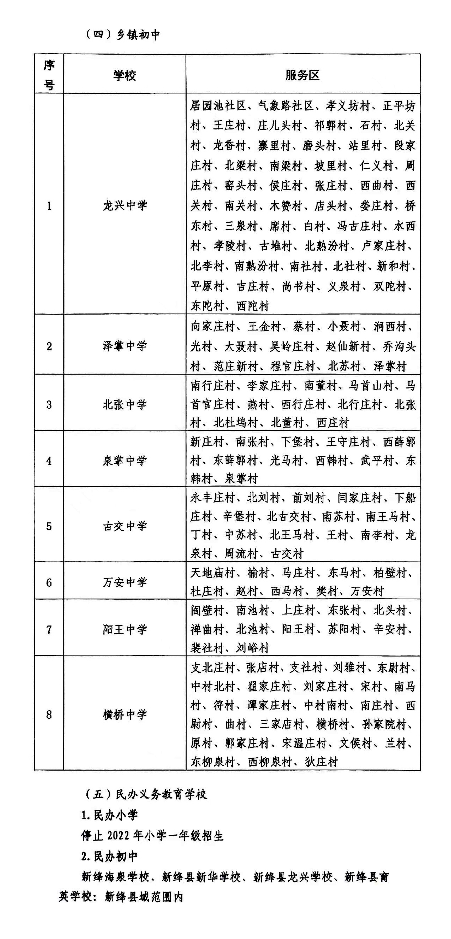 经批准保留的新绛海泉学校、新绛县龙兴学校、新绛县新华学校、新绛县育英学校、新绛县汾河中学5所民办义务教育学校2022年暂停小学一年级招生。新绛海泉学校、新绛县龙兴学校、新绛县新华学校、新绛县育英学校4所民办义务教育学校初一年级招生与公办义务教育学校同步网上进行。民办义务教育学校初一年级招生范围为新绛县域,不得跨县域招生,更不得跨市域招生。