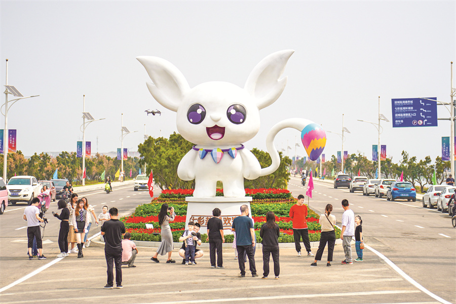 9月18日,市民在七彩盐湖景区新亮相的盐精灵雕像前拍照。