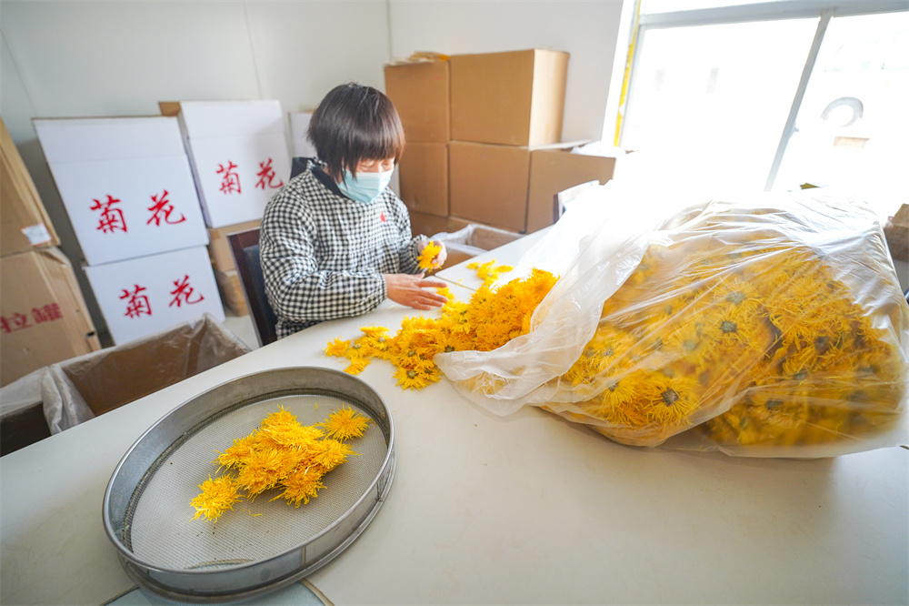 公司总经理郑建民介绍,菊花从采摘到烘干,再到按不同的型号分拣包装,共需19道工序。