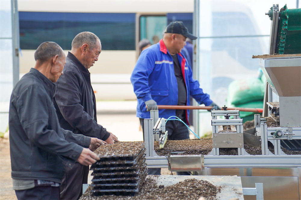 芮城县学张乡斜口村标准化育苗大棚内,工人在进行机械化基质装盘。