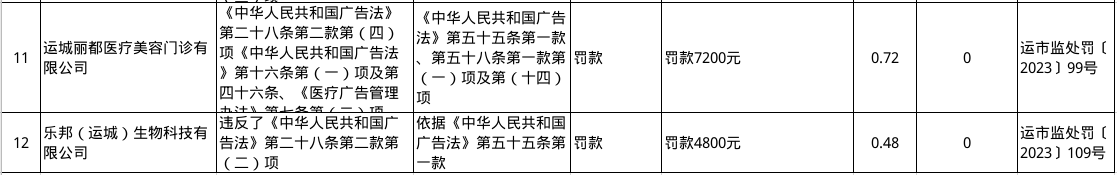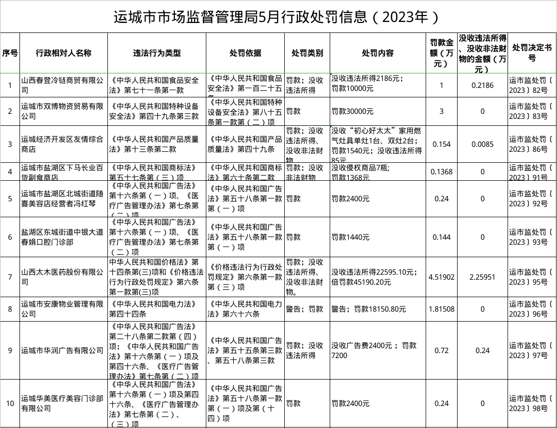 运城市市场监督管理局5月行政处罚信息(2023年)