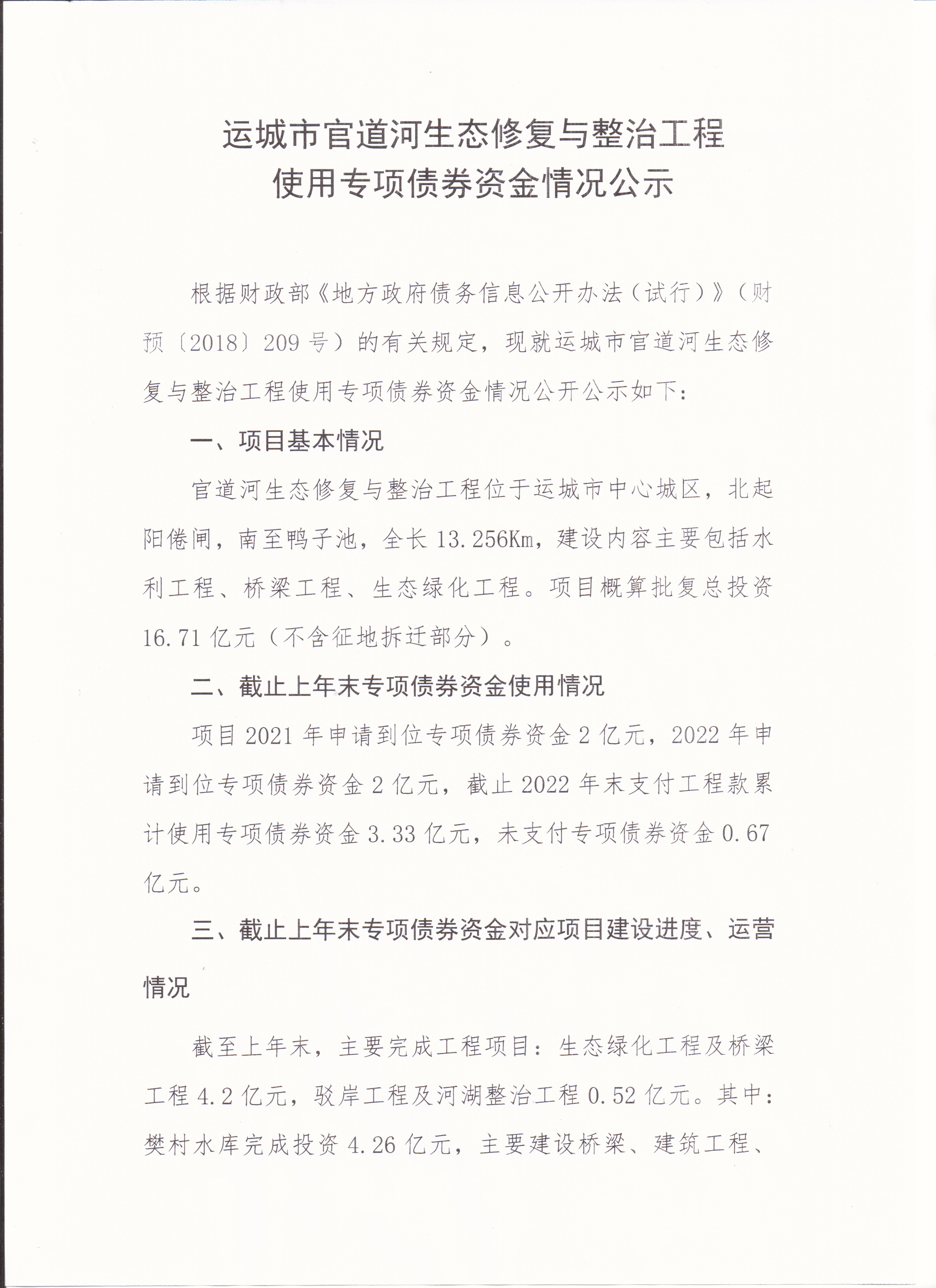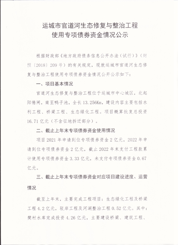 运城市官道河生态修复与整治工程使用专项债券资金情况公示