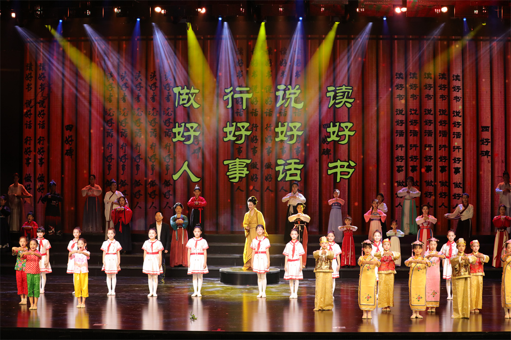 明正德七年,一块普通的石头在工匠的凿刀下,留下了“四好”箴言。直至今天,它仍在讲述着自己的故事。关公后人关战兵与它相遇在舞台上。在对话中,关娘娘采药救民的故事浓情铺陈。这是仁爱的故事,关娘娘训诫其子关平、关兴,教导兄弟二人以家风家训。一块“四好碑”,见证了一个家庭良好家风家训的传承和弘扬,镌刻出仁者爱人、处世以仁的家国情怀。500余年时光,不仅“四好碑”留存至今,它蕴含的关公精神也历久弥新。光影变幻间,不同时空的孩子们轮番登场,诵读关帝“四好”,展现中华传统美德“仁”的精神魅力,体现中华优秀传统文化“讲信和睦、亲仁善邻”的交往之道。