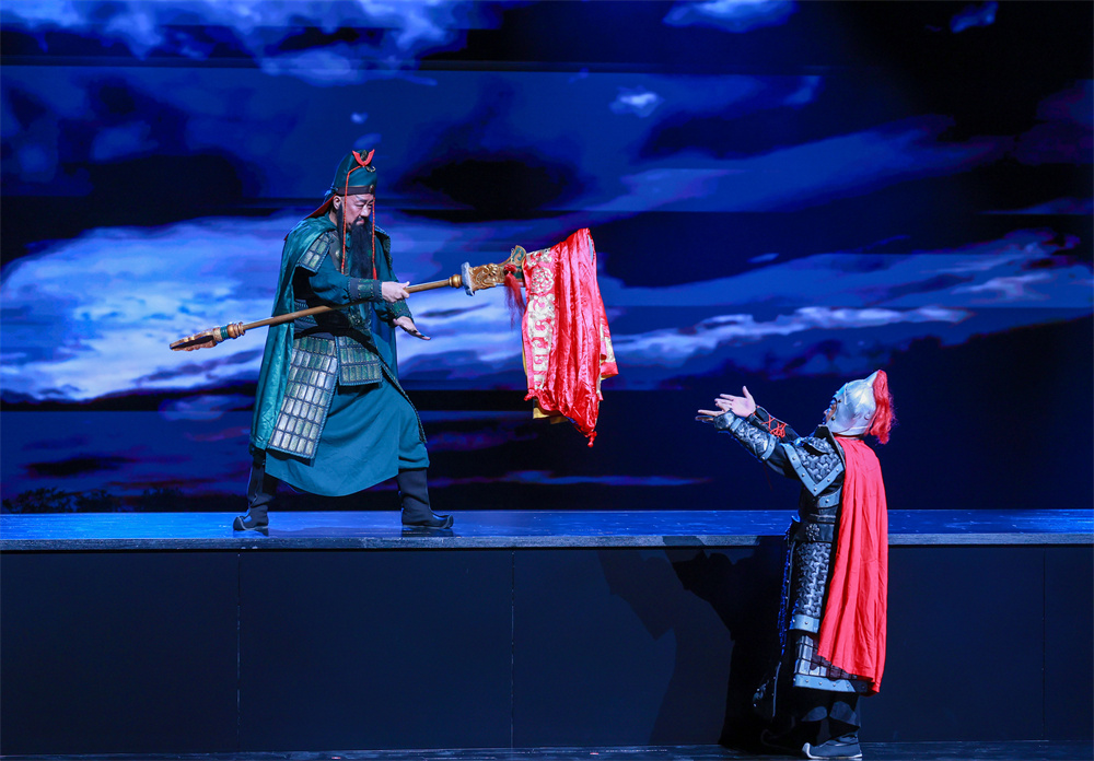 历史的大门已然开启,关公的轮廓逐渐清晰。再往深处走,传来稚嫩的童声。“古华夏,看河东;大英雄,出运城;解州城,关帝庙;敬武圣,拜关公……”是的,山西运城,是这位传奇人物的家乡。大屏幕上笔墨绘千秋,依托现代舞台技术,关公的形象在历史和现实的交织中呈现在观众眼前。