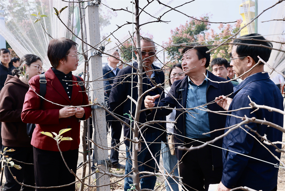 10月24日,与会嘉宾在临猗县北辛乡苹果现代化标准示范园讨论交流果树管理技术。