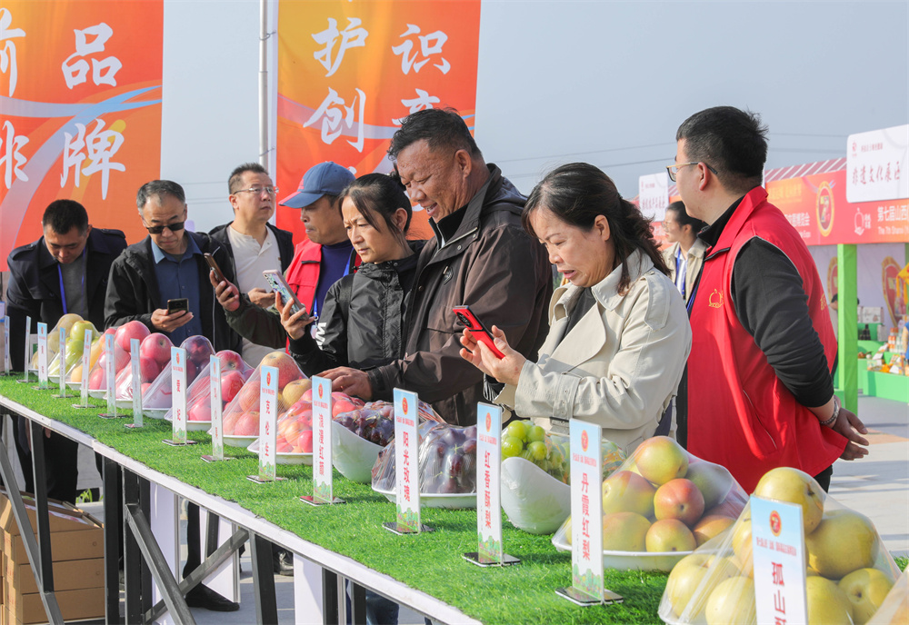 10月24日,参加第七届山西(运城)国际果品交易博览会的嘉宾在万荣分会场参观。