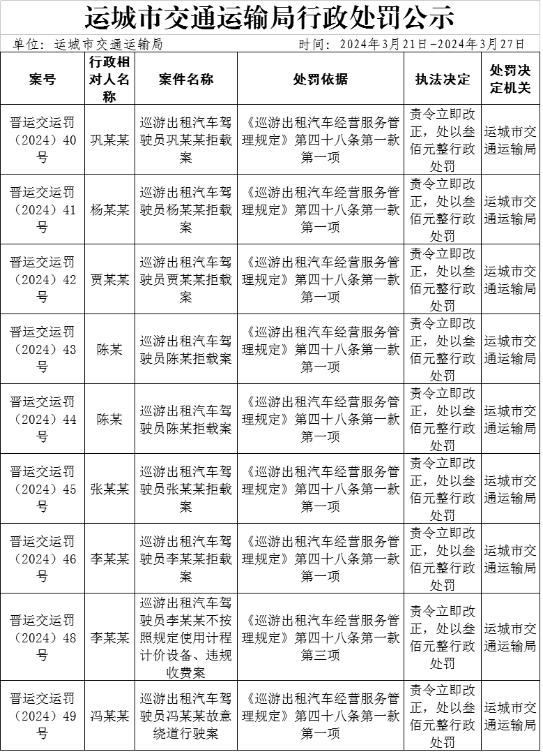 运城市交通运输局行政处罚公示(2024年3月21日-2024年3月27日)